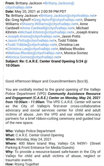 VPD Spokeswoman Brittany Jackson emailed details to the Vallejo City Council and city staff at about 2 p.m. Thursday about a new Community Assistance Resource and Engagement (CARE) Center opening up to assist abuse victims.