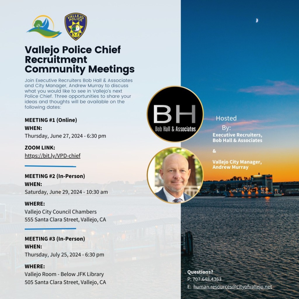 Questions about the police chief recruitment can be directed to the city’s Human Resources Department, (707) 648-4363, human.resources@cityofvallejo.net