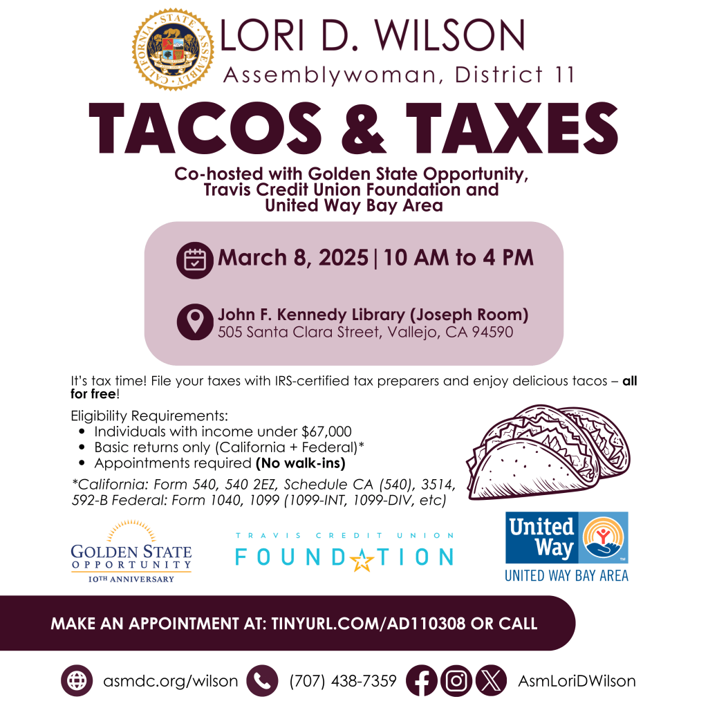 State Assemblywoman Lori D. Wilson, D-Suisun City, will be hosting a free Taco and Taxes event on Saturday, March 8 from 10 a.m. to 4 p.m. inside the John F. Kennedy Library (Joseph Room), located at 505 Santa Clara Street in downtown Vallejo, her office announced.