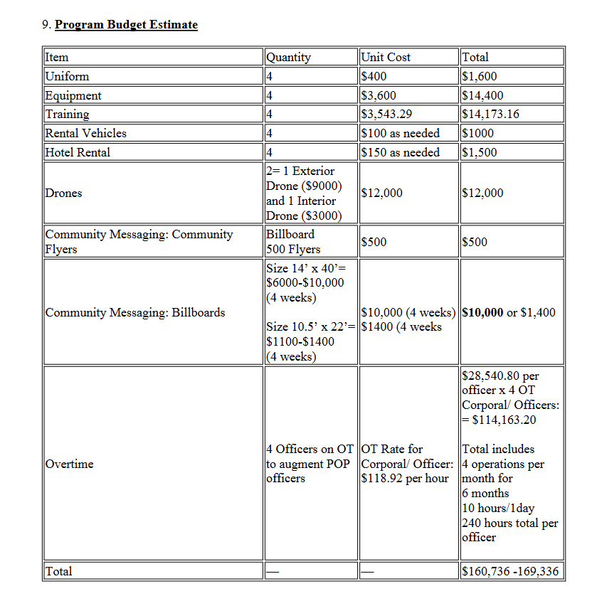 The bulk of the overall budget, more than $114,000, is expected to be spent on overtime for four officers to augment the POP team.