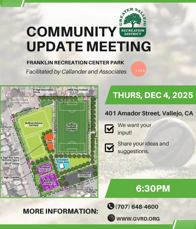 VALLEJO – The Greater Vallejo Recreation District (GVRD) has scheduled a meeting next month to allow residents to receive information about the future of the Franklin Recreation Center Park, located at the former Franklin Middle School site, the district announced on Monday.