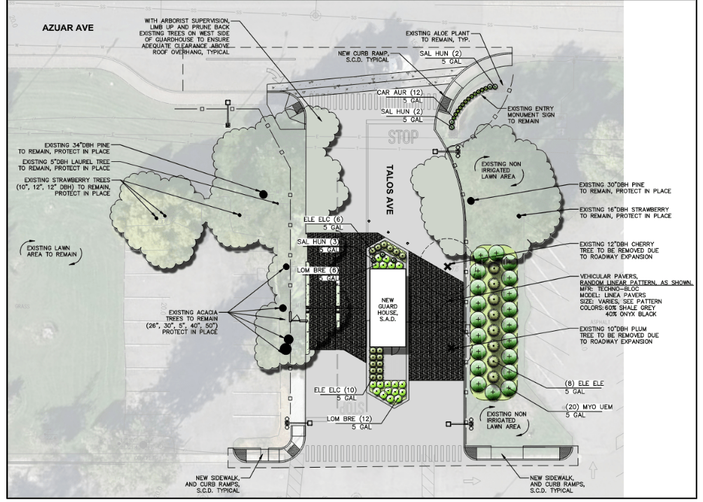 historic property. None of the historic districts contributing buildings or landscape elements are proposed to be altered as part of the project,” staff wrote in a report to the commission. “The proposed median and paving proposed to be removed to accommodate the construction of the new guardhouse are typical materials that do not characterize the property or its historic significance.”