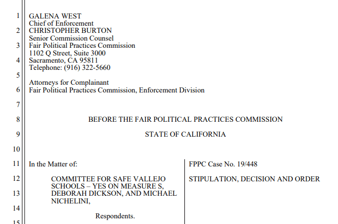 by John Glidden | Oct. 15, 2020 VALLEJO –A committee opened to support passage of a Vallejo school bond has been fined $6,500 by the state’s election watchdog after two committee officials failed to disclose campaign information in a timely manner. The Fair Political Practices Commission (FPPC) issued the fine on Thursday against the Committee forContinue reading “Vallejo committee fined for campaign disclosure violations”