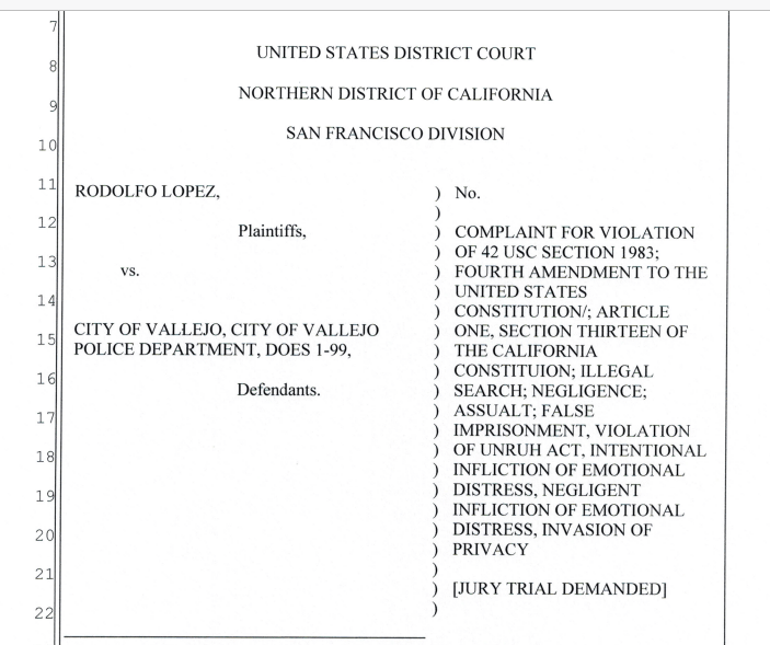 The city defending itself in 23 federal civil cases involving Vallejo PD by John Glidden | Aug. 28, 2020 A Vallejo man is suing the city and Vallejo Police Department alleging he was the victim of excessive force after numerous officers entered his home without a warrant and physically assaulted him during a September 2018Continue reading “Vallejo facing another excessive force lawsuit”